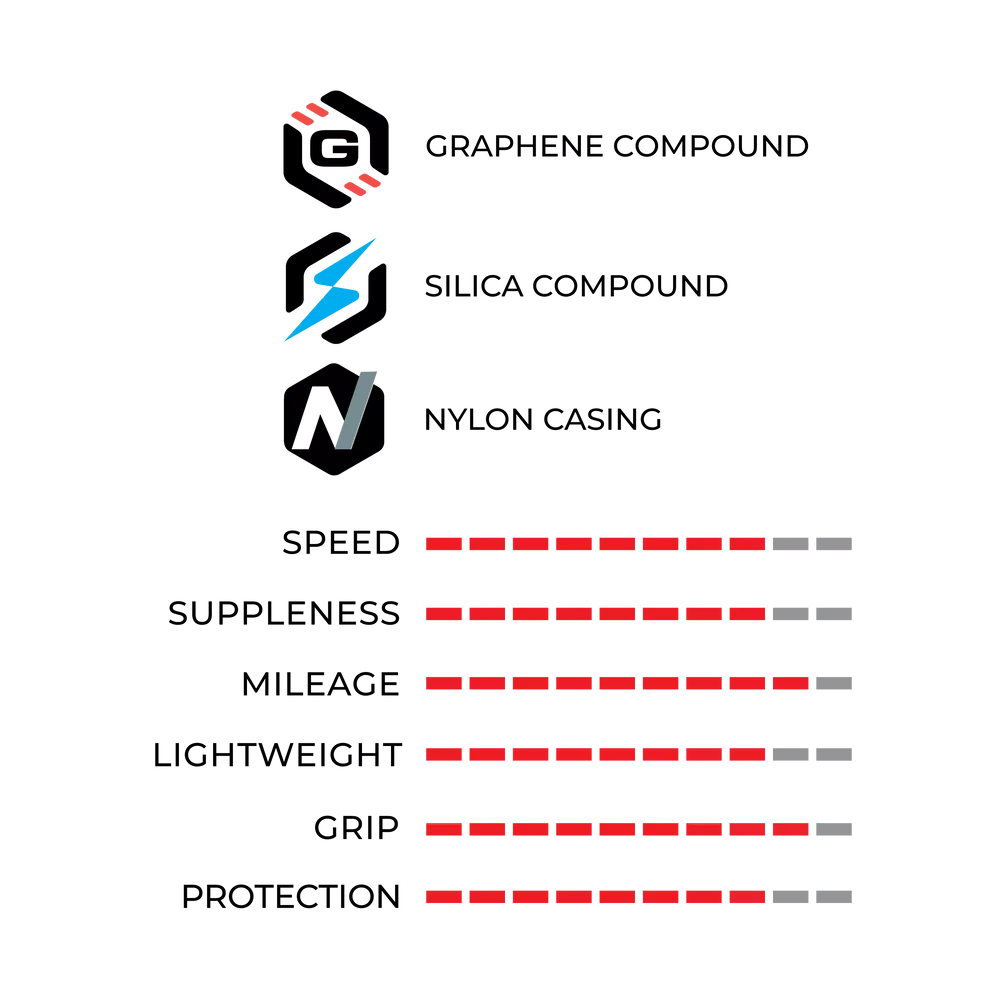 - Corsa N.EXT combina cunostintele fara egal de la Vittoria despre performanta la curse cu durabilitatea unei carcase de nailon de lunga durata care utilizeaza un compus unic de siliciu si grafen pentru eficienta imbunatatita de rulare, aderenta si durata mai lunga de uzura.