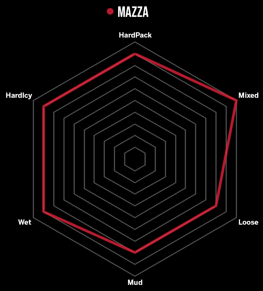 - Marginea anterioara in trepte se rostogoleste ca o rampa, dar se adanceste in urcari, facand din Mazza o alegere de top atat pentru utilizare in fata, cat si in spate. Spatiul substantial a fost proiectat in partea centrala a benzii de rulare pentru a oferi tractiune de franare, in acelasi timp accelerand curatarea.